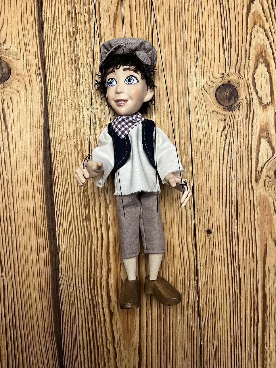 Nová marioneta Pinocchio velký je tentokráte téměř v celodřevěném provedení. S vahadlem, i díky ,,více,, kloubovému zpracování, se řadí k profesionálním marionetám, avšak mile doplní i domácí prostředí rodinných divadélek či dekorací. Mechanismus uvnitř hlavy umožňuje mrkání očních víček a dalšíjednoduchý systém dovoluje ohýbání prstíků. Pinocchio je snadno a opravdu velmi pohyblivý. Celá marioneta je ruční prací od šití, odlévání s malováním, po vyřeřezávání či broušení. Vše s citem pro kombinaci materiálů i výběr barev...