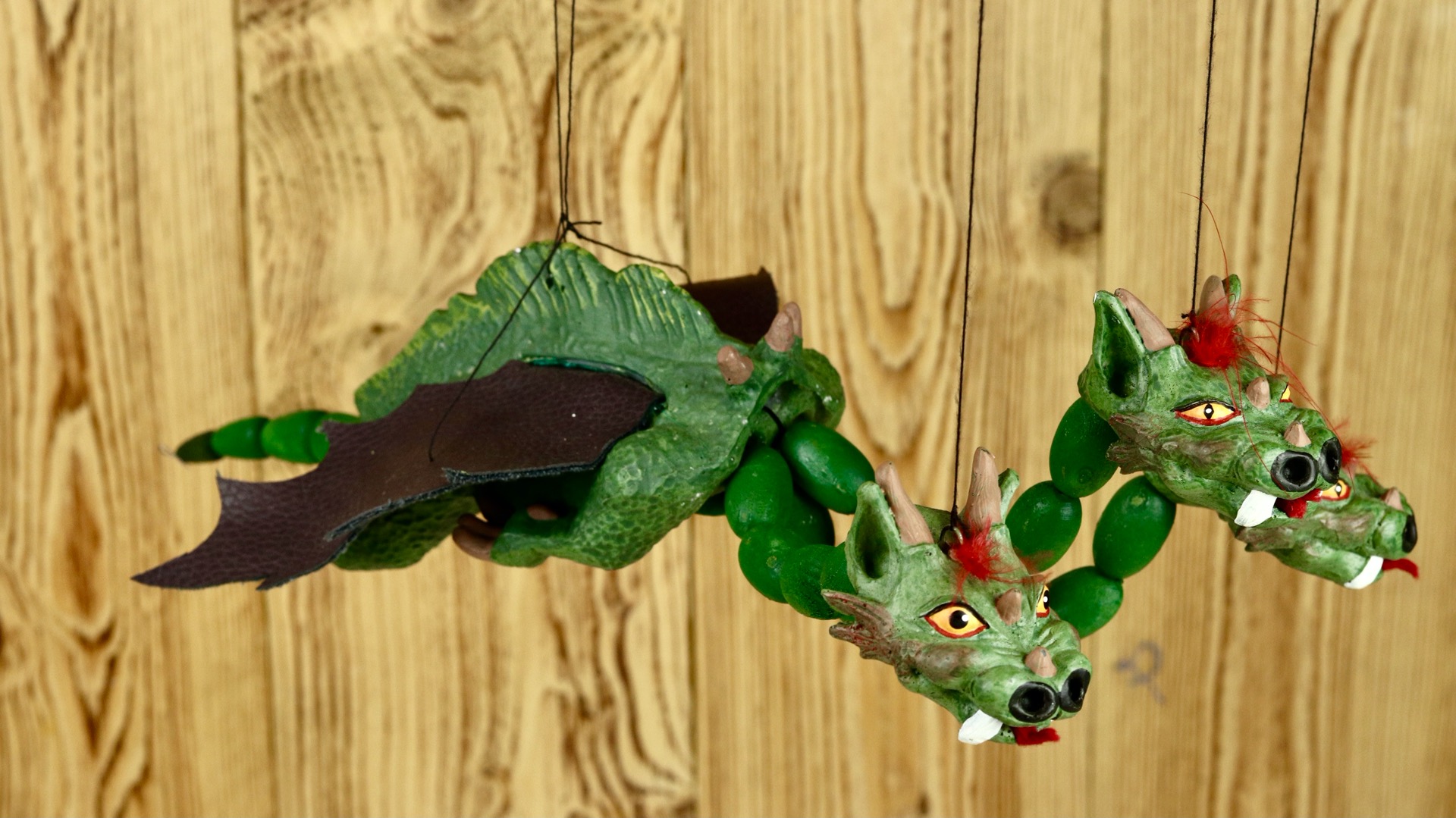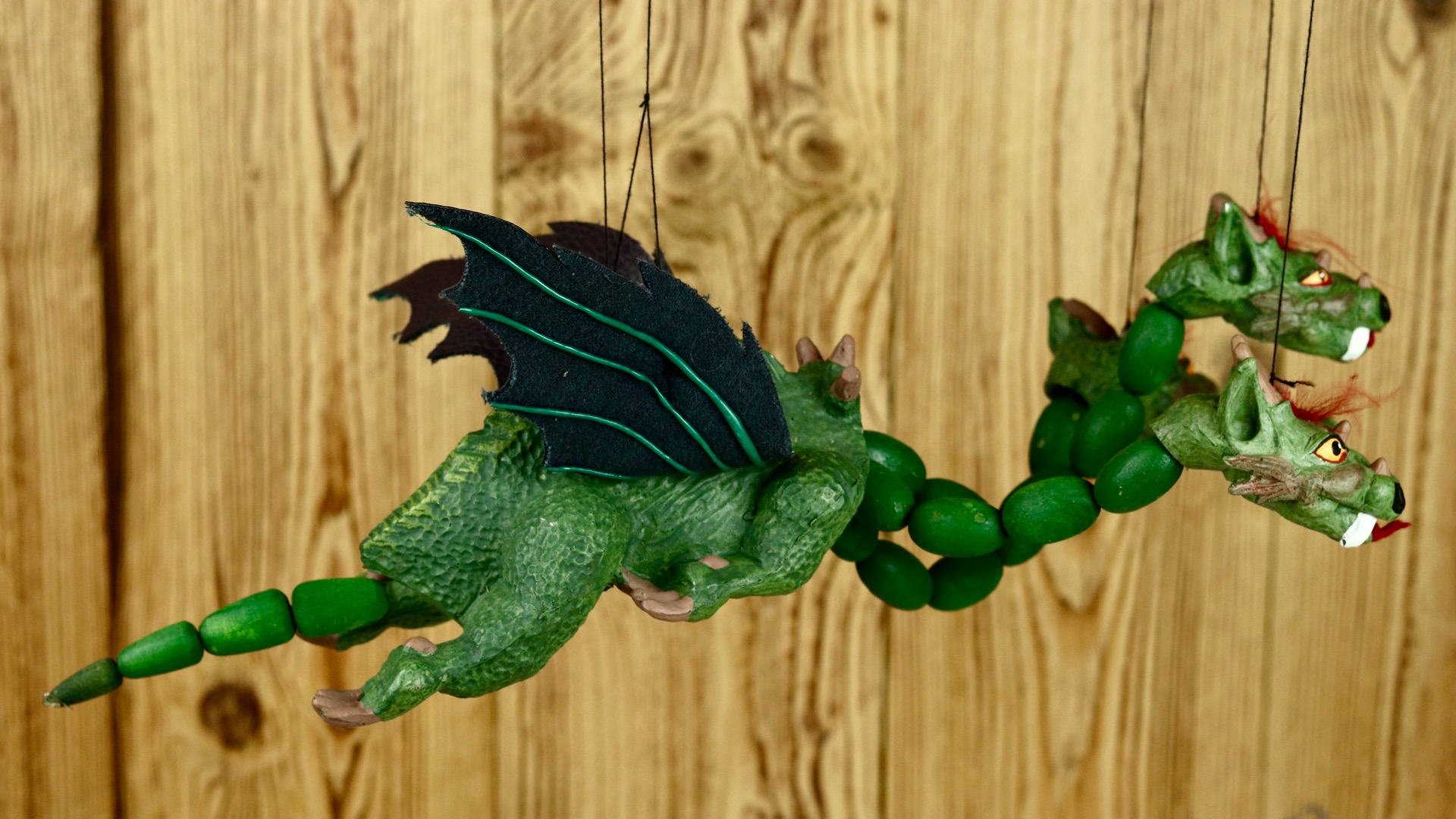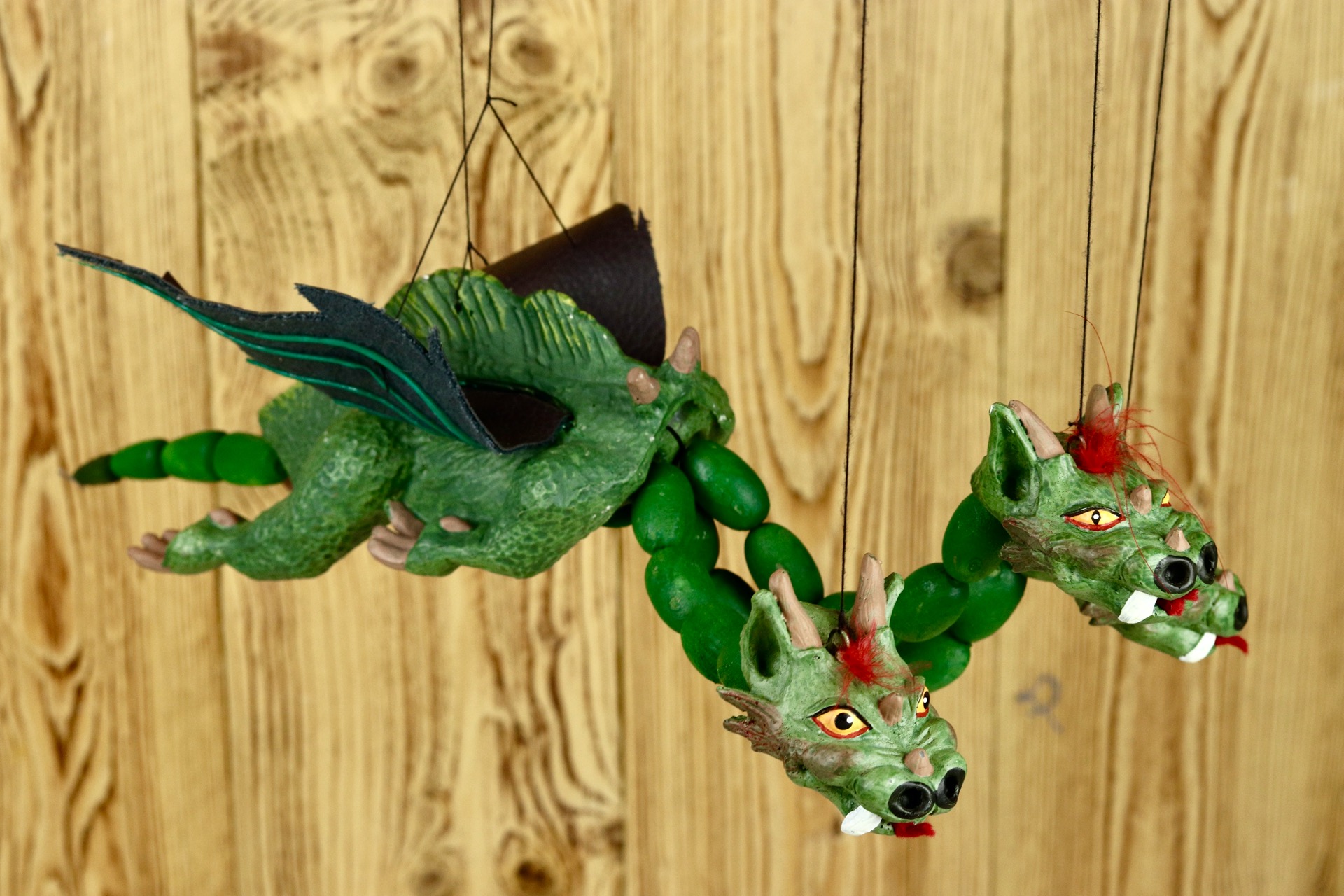 Marioneta draka je ovládána shora pomocí speciálního, jednoduchého vodícího systému. Hlavičky s tělem jsou zhotoveny spojením odolné, zdravotně nezávadné pryskyřice a parafínu. Vodící systém dřevěný s ocasem z dřevěných korálů.