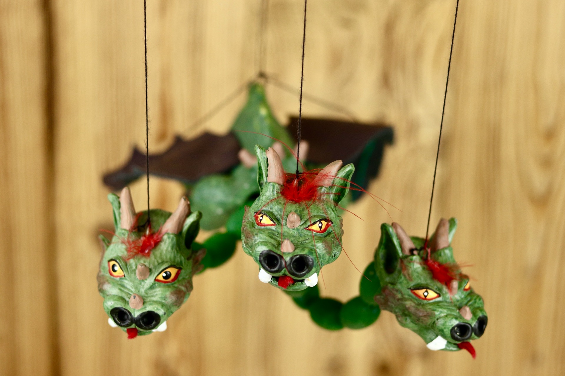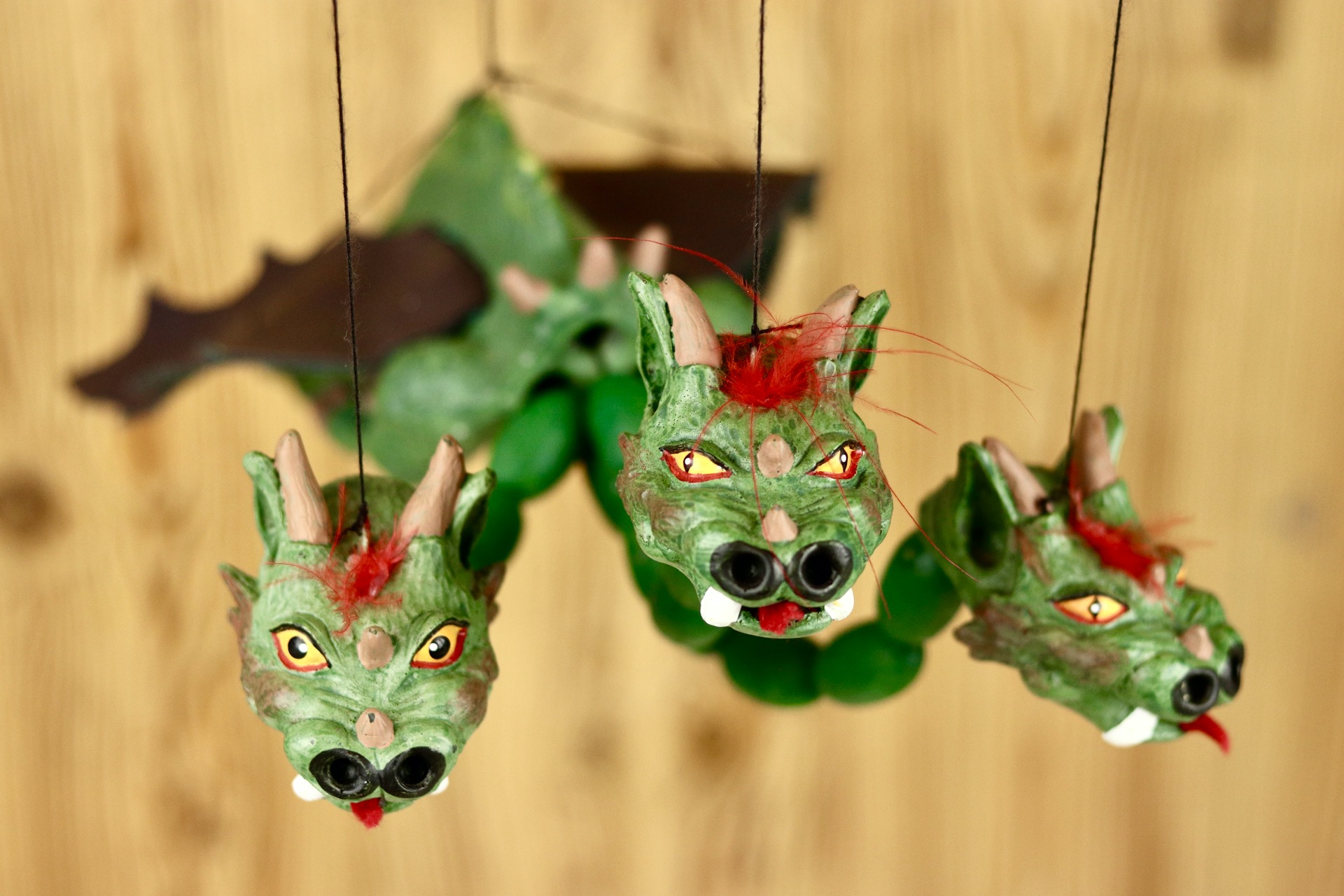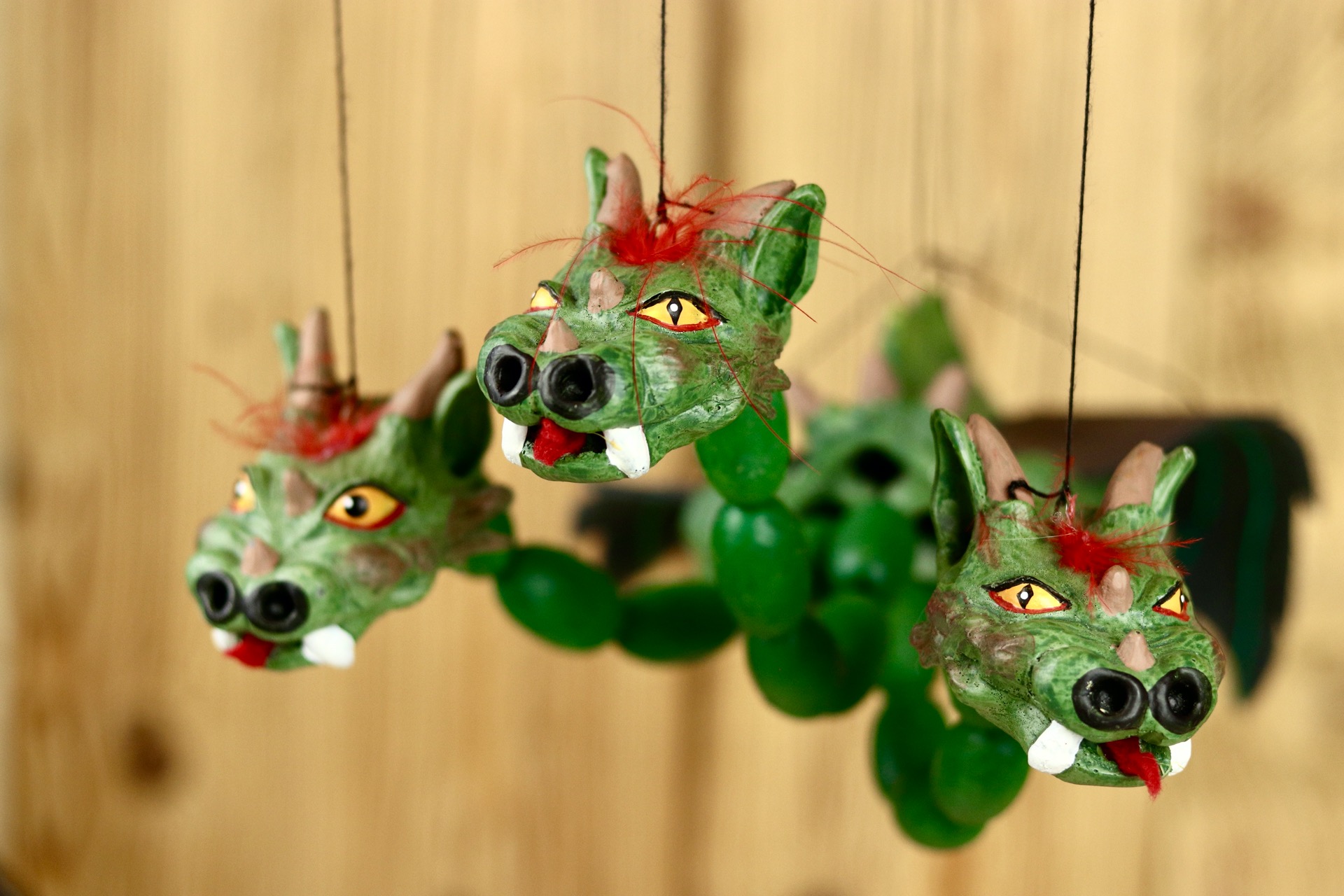 Marioneta draka je ovládána shora pomocí speciálního, jednoduchého vodícího systému. Hlavičky s tělem jsou zhotoveny spojením odolné, zdravotně nezávadné pryskyřice a parafínu. Vodící systém dřevěný s ocasem z dřevěných korálů.